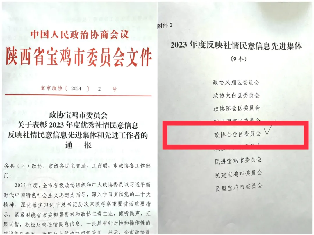 经常性工作出色出彩。发挥协商式民主监督优势,组织委员对全区2024年部分重点项目进行集中视察,让政协监督与发展同频。加强政协工作制度化、规范化、程序化等功能建设,修改完善委员联系界别群众、加强和改进反映社情民意信息工作等8项制度。全年编发社情民意信息112篇,其中《关于设立陕西“企业家日”的建议》等23篇信息被省市政协采用,《大力运用“云影像”技术 减少病患下载打印检查资料不便》被省政协评为2024年度优秀社情民意信息,反映社情民意信息工作取得本届以来最好成绩。协商调研精益求精。针对城市商圈建设、提升金河工业走廊发展水平、强化民营经济发展动能等课题,委员们在十届三次全会上提出意见建议68条,得到区委区政府领导高度肯定。精选“新质生产力”“数字经济与产业转型升级”“职业健康卫生”等10个课题开展专题调研,形成的调研成果得到区委区政府的高度重视和采纳。“智慧政协——金台政协”APP上线试运行,与省市政协联动开展网络议政、远程协商3次。拓展“秦商量·码上办”形式,开展微协商12次,收集委员意见建议189条,交办102件,部门采纳办理60件,形成“议、转、交、办”全流程协商链条。这一年,金台政协以助推高质量发展为己任,紧扣金台高质量发展“1239”行动想大局、议大事、谋大计,做到与时代发展脉搏同频共振, 与中心工作同频同步,与群众所需所盼共振共鸣。